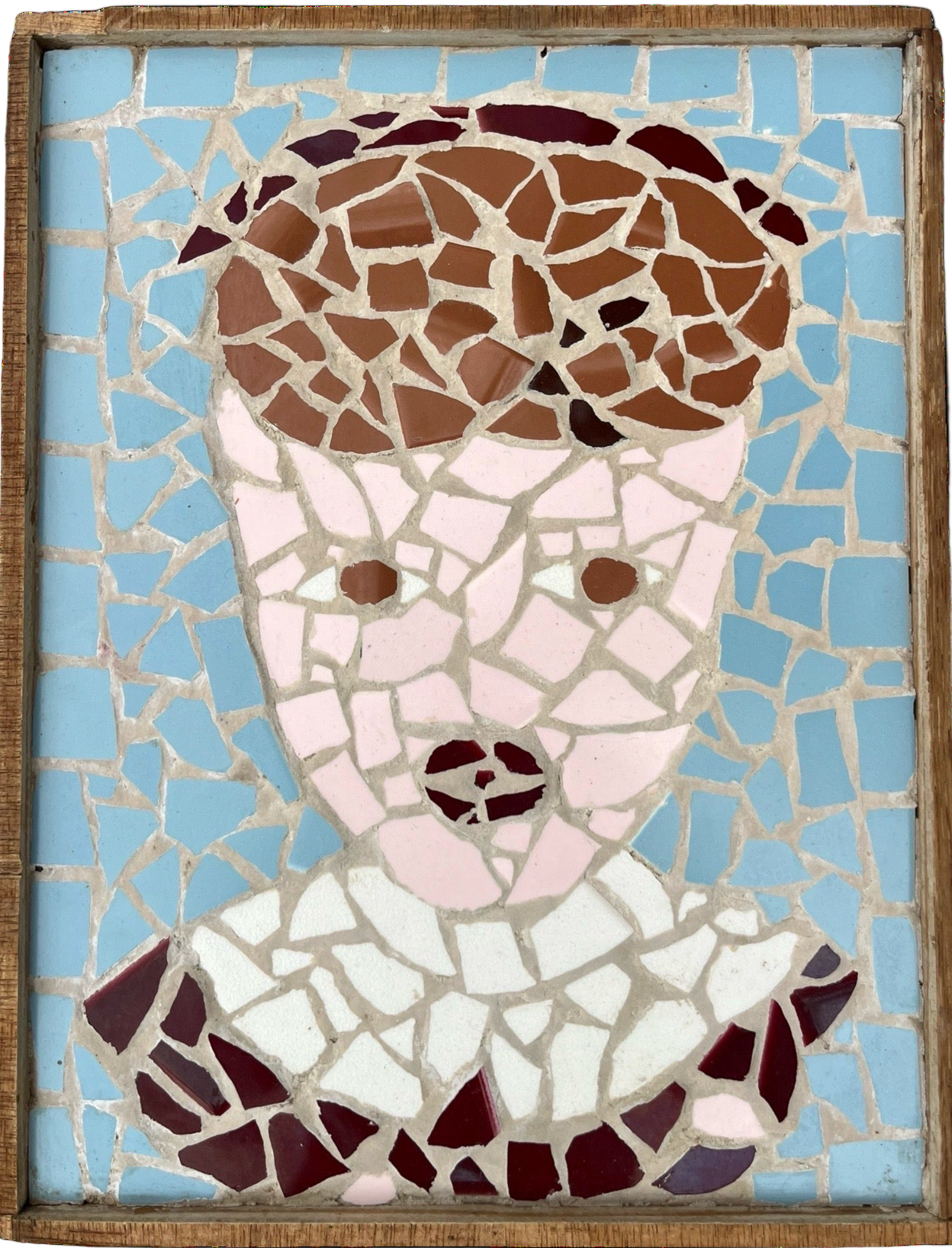 Mosaic portrait of a person in torn clothes. Handmade with broken tiles, framed, and full of raw character.