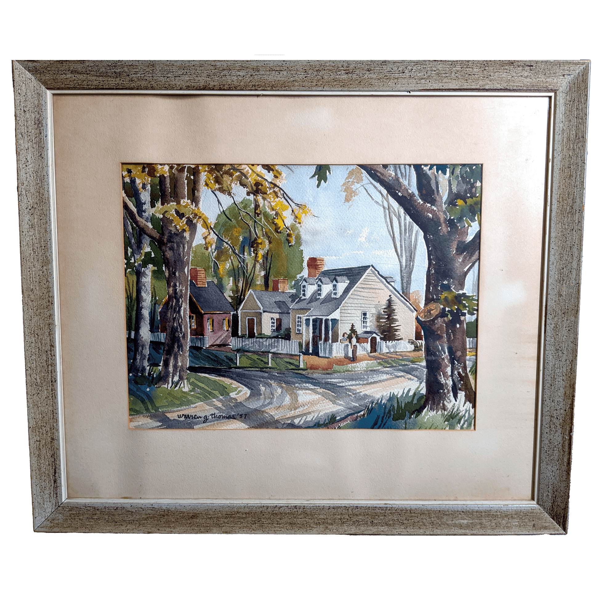 Experience the inviting warmth of vintage Americana in this sunlit watercolor, where towering trees and cozy homes line a winding street. Crisp brushstrokes and gentle washes evoke an autumn glow, immersing you in the nostalgia of simpler days. It’s a captivating work that speaks to anyone who cherishes the heartfelt charm of classic American life.