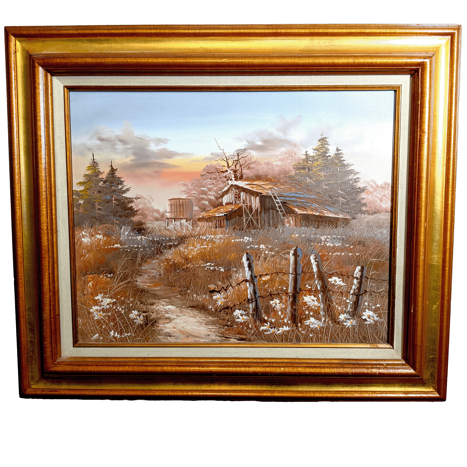 A serene testament to rural charm, this idyllic farmstead painting captures the warmth of a bygone era. Soft golden tones merge with sunset hues, illuminating an old barn, rusted water tower, and fields sprinkled with wildflowers. The gentle brushstrokes lend a sense of comfort and nostalgia, as if inviting you to step into a simpler time and place.