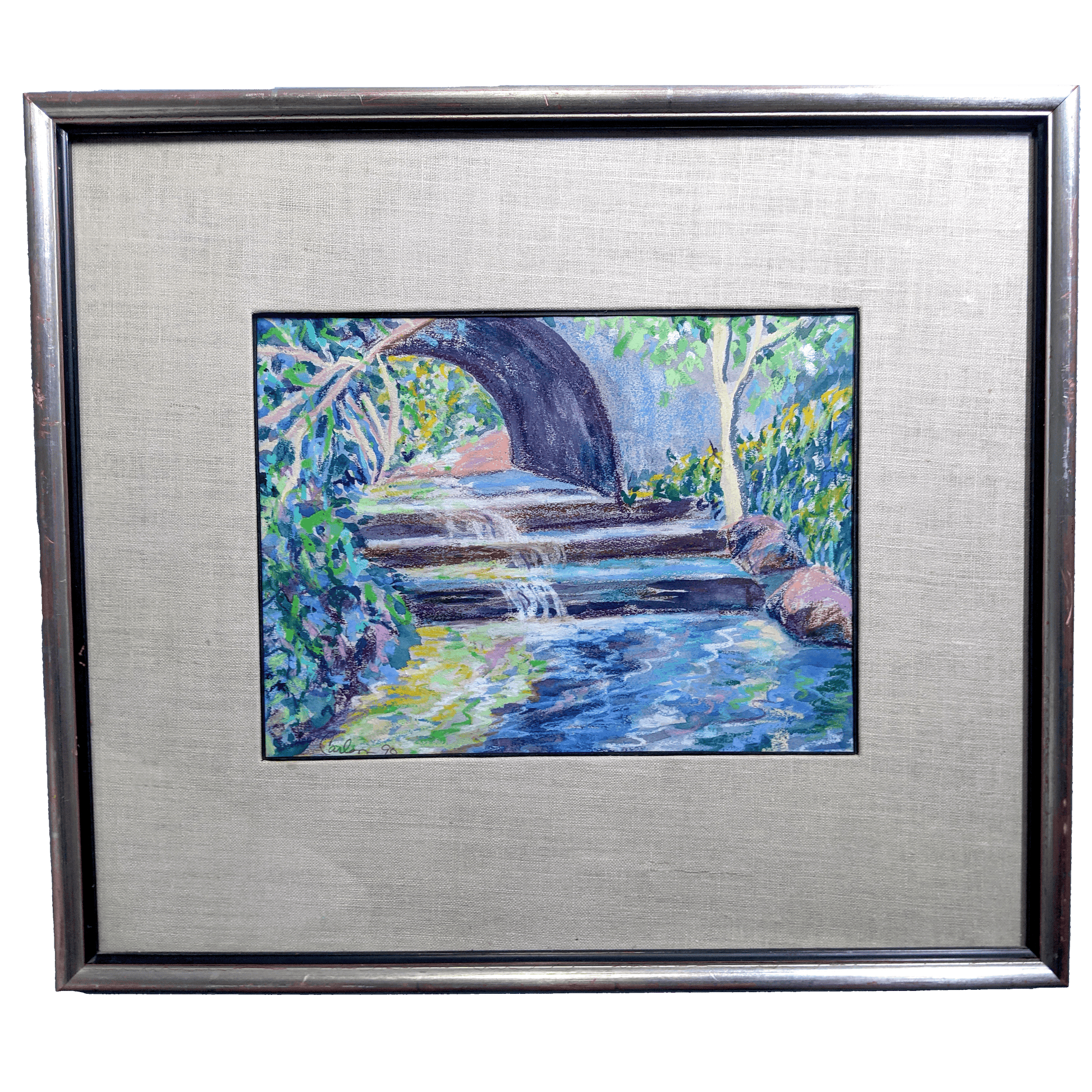 A hidden oasis drenched in vibrant color, this enchanting painting depicts a graceful arch bridging gently cascading water. Painted in luminous, impressionistic strokes, the scene teems with dappled sunlight dancing across foliage and flowing streams, evoking a sense of tranquil discovery. It’s a quietly dramatic homage to nature’s secret sanctuaries, certain to captivate discerning collectors.
