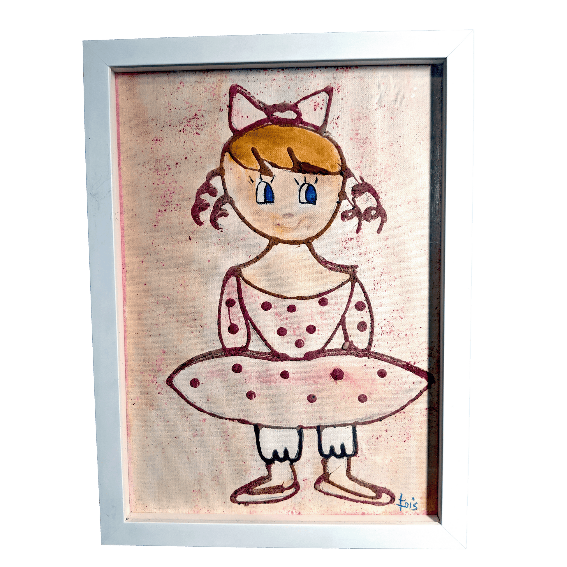 Step into a world of youthful charm with this enchanting portrait. Painted in a swirl of sweet pinks and playful polka dots, the piece exudes innocence and delight, reflecting the artist’s whimsical spirit. A radiant conversation starter, it lifts the ambiance of any space with its sweet sense of nostalgia.