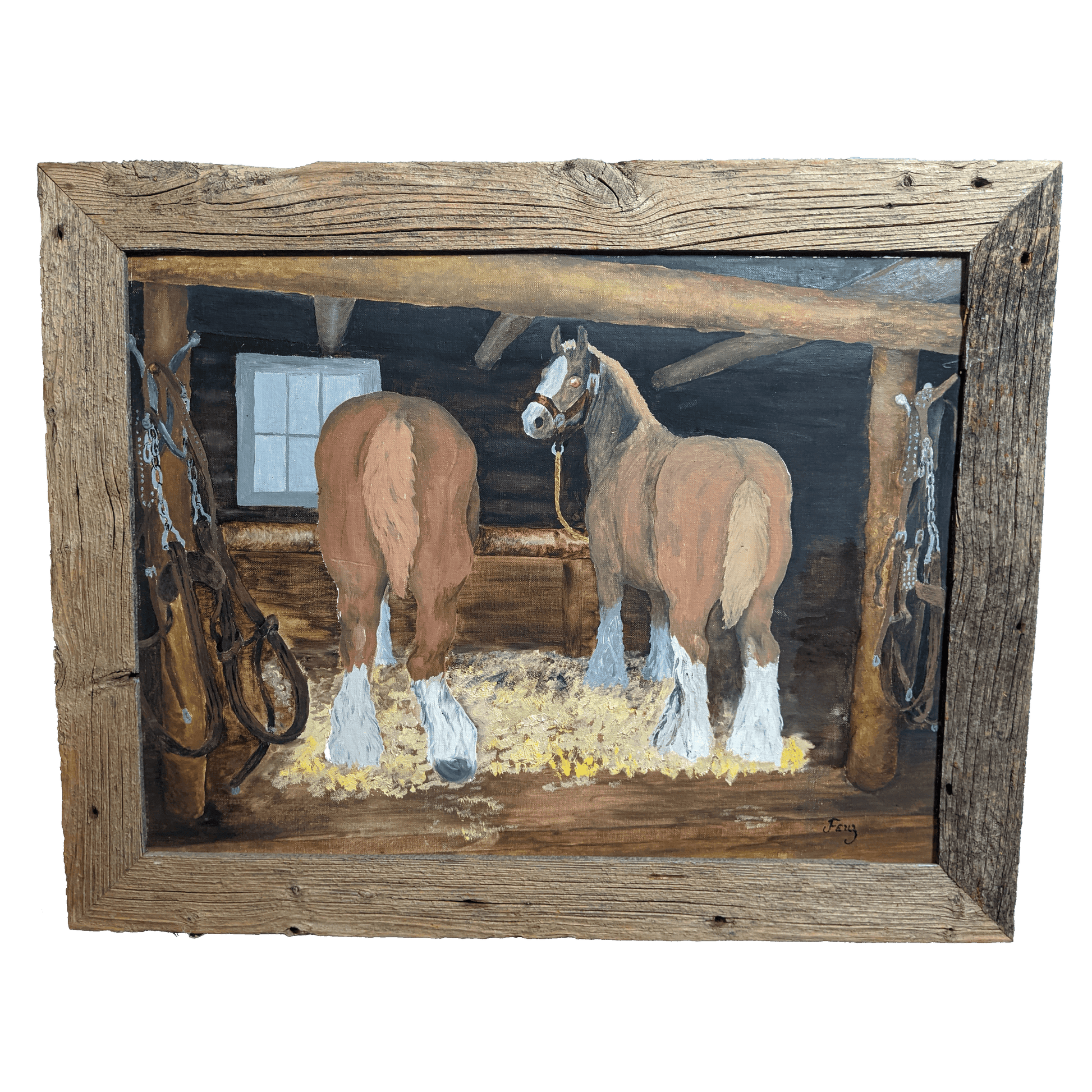 Two magnificent horses stand in quiet grandeur within a rustic stable, their rich brown coats accented by white feathering on sturdy legs. Framed in reclaimed wood for an authentic barnyard feel, this painting exudes a timeless warmth that speaks to the simple beauty of country life. Ideal for collectors seeking a piece that merges pastoral nostalgia with a commanding presence.